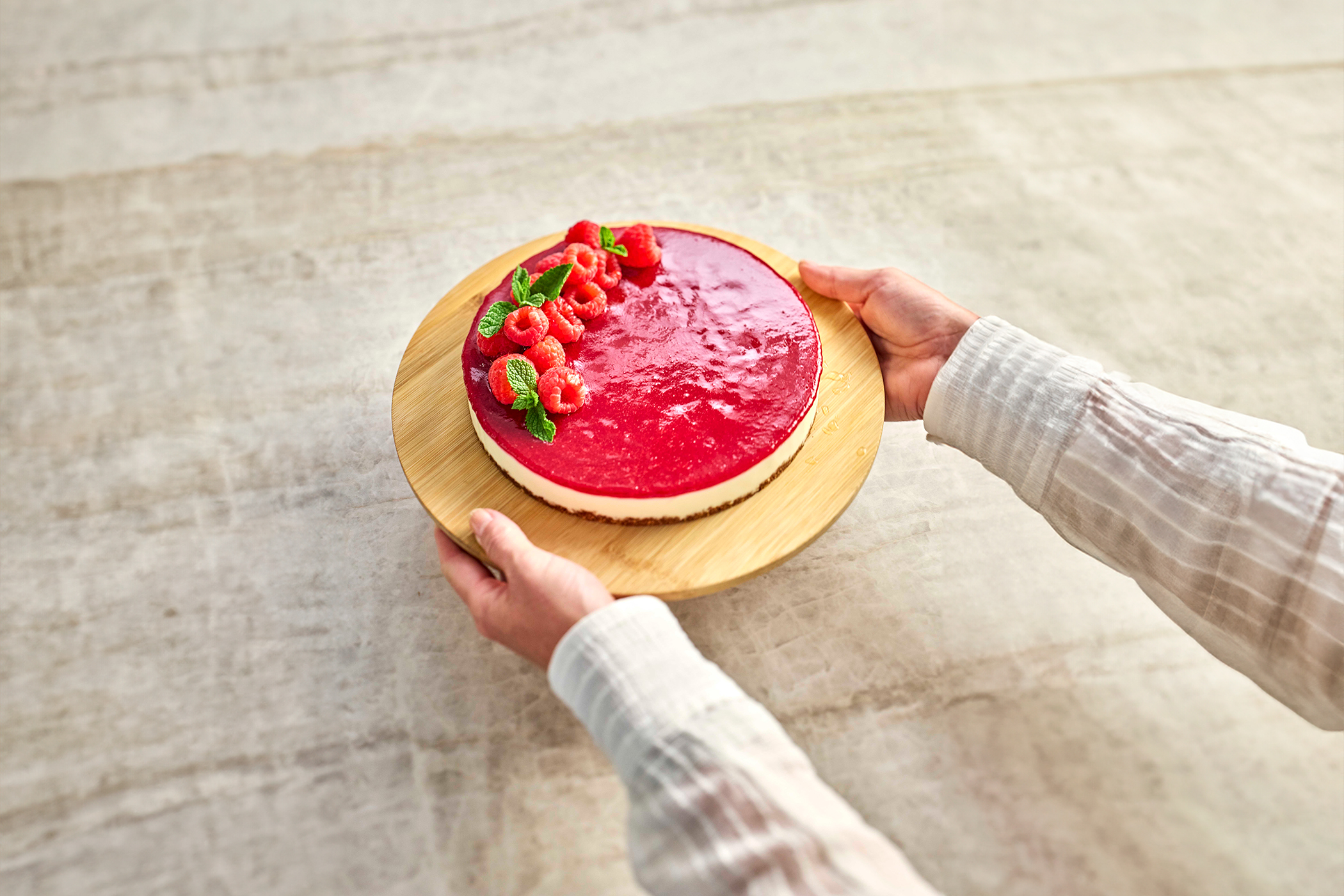 Zelfgemaakte kaastaart met spiegel van frambozencoulis
